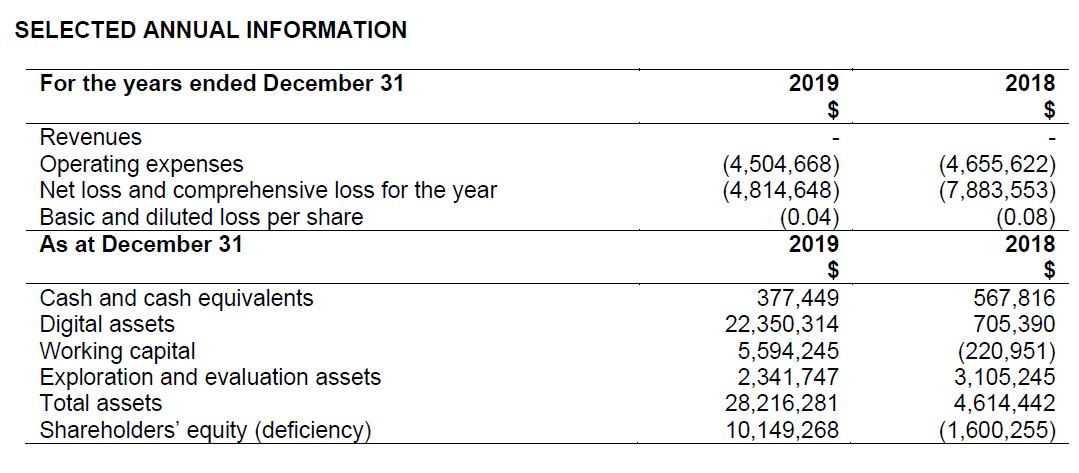 For the year ended December 31, 2019, the Company recorded a net loss of $4,814,648 (2018 - $7,883,553) and had a cumulative deficit of $20,731,313 (2018 – $21,925,471) and non-controlling interest of $9,244,559 (2018 - $nil). The Company had no source of operating revenues or any related operating expenditures.