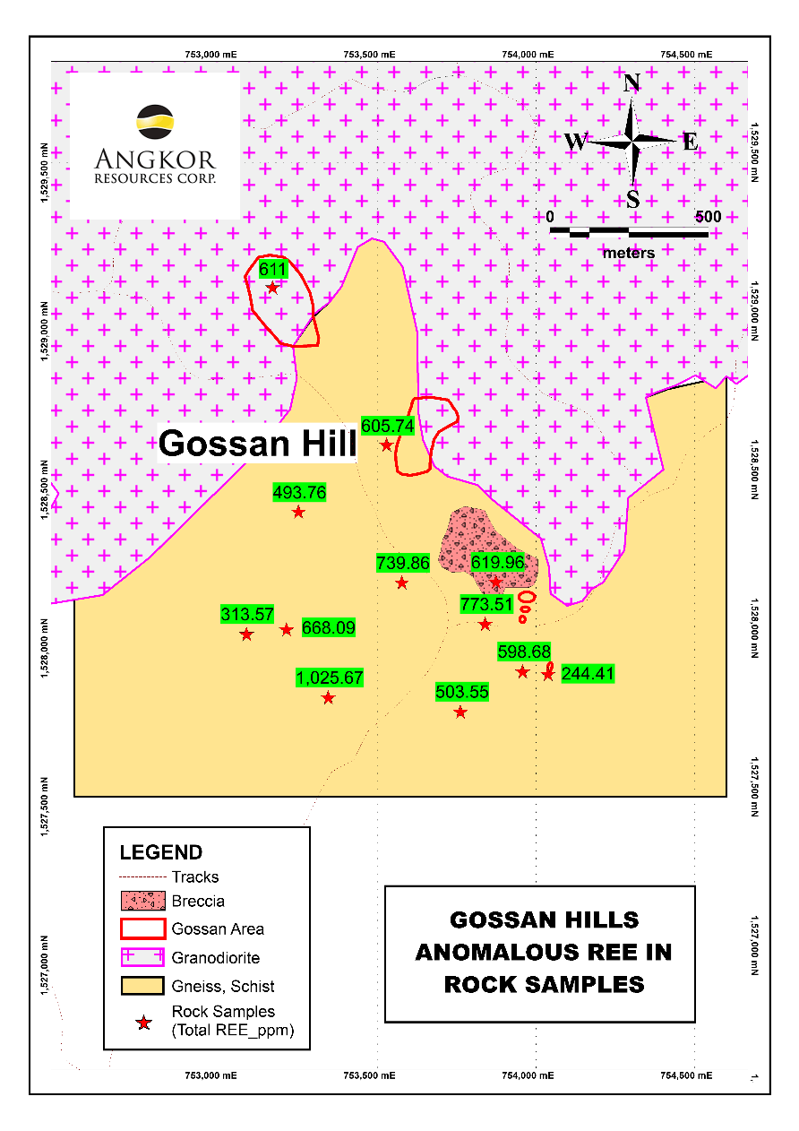 GRANDE PRAIRIE, AB – TheNewswire - Jan. 25, 2022 - Angkor Resources Corp. (TSXV:ANK) and (OTC:ANKOF) (“Angkor” or “the Company”) reports it received the first 12 assays on rare earth elements (REEs) of surface laterite samples from Gossan Hills prospect on the 100% owned Andong Meas license.