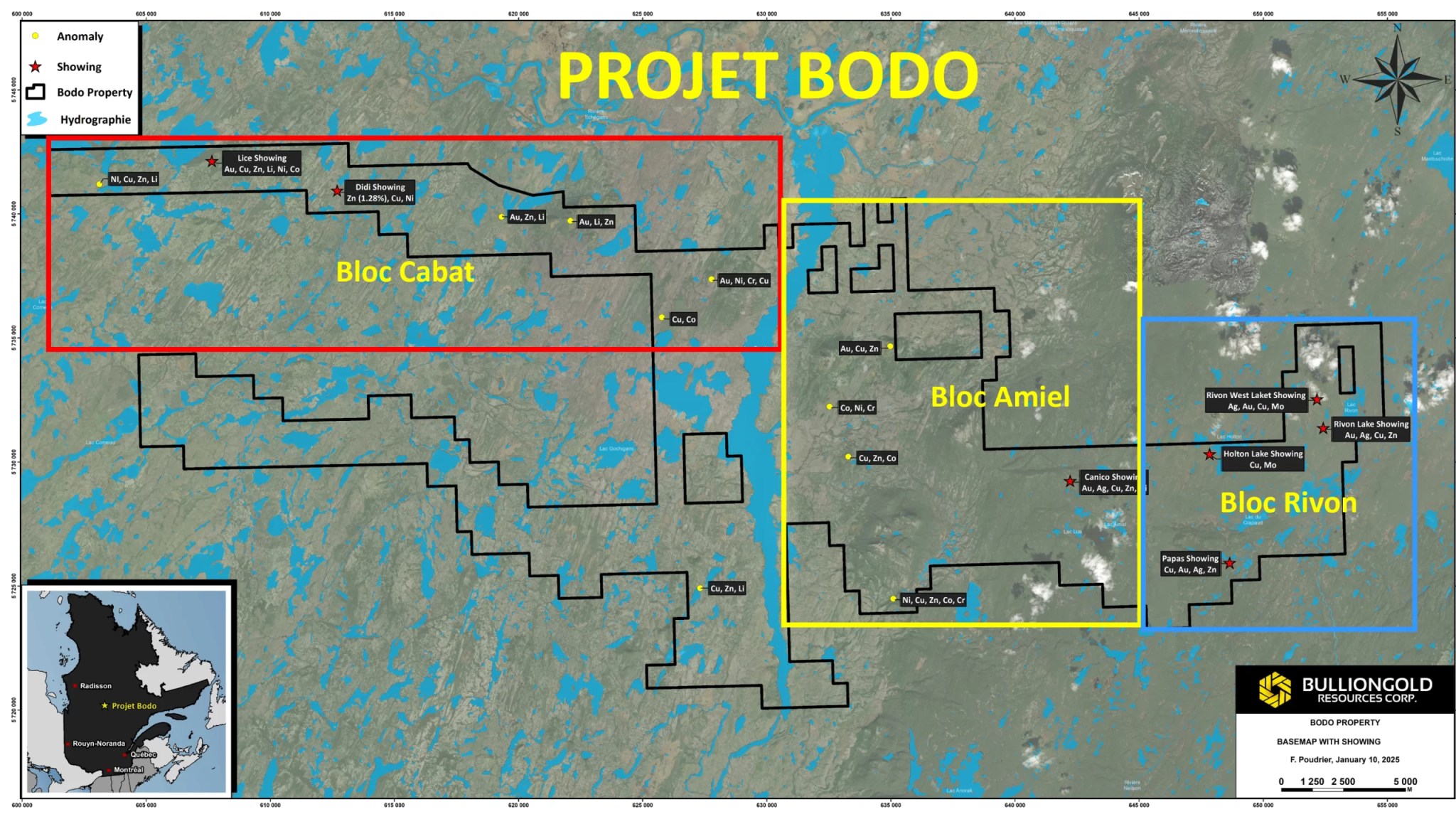 Montreal, Quebec--(Newsfile Corp. - August 14, 2025) - Bullion Gold Resources (TSXV: BGD) ("Bullion Gold" or the "Company") announces the completion of a field prospecting program on its wholly owned Bodo property, consisting of 761 mining claims covering 410 km², located in Eeyou-Istchee Baie-James, Northern Québec. The Company confirms the presence of a Cu-Au-Ag-Zn corridor extending approximately 3 km north-south by 0.8 km wide along the Rivon Lake copper system.