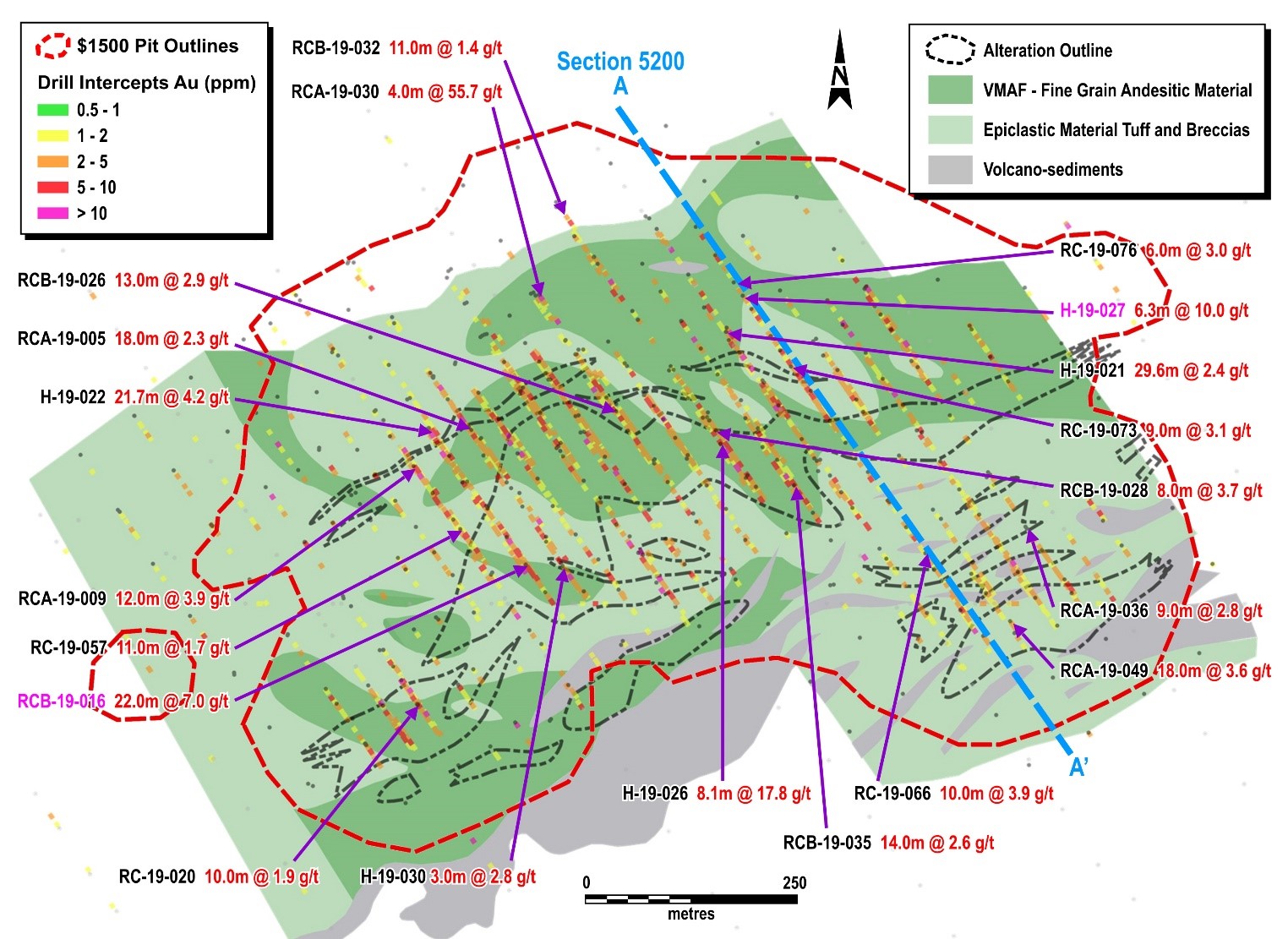 The 2019 Maiden Resource covers only the principal part of Kari Center Main, at the volcanic/sediment contact, trending N60° over a length of 800 meters.