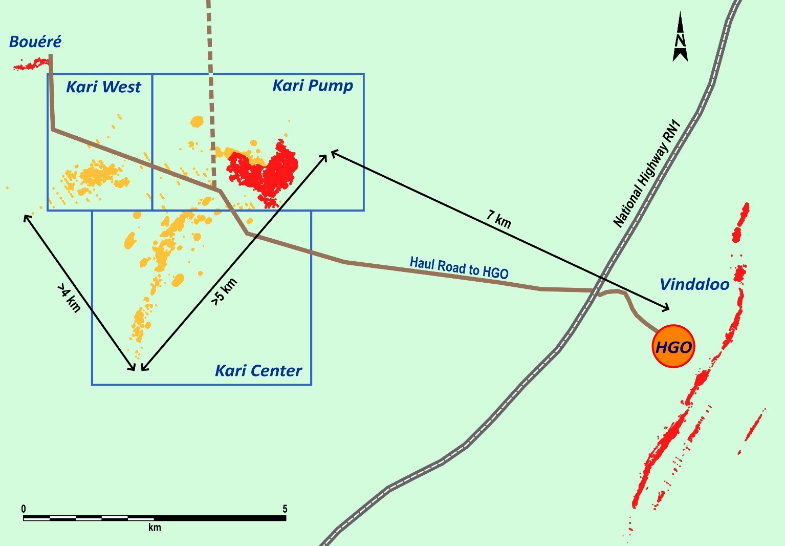As shown in Figure 1 below, the Kari area is a large gold-in-soil anomaly which covers an area 6km long by 3km wide and is located 7km northwest of the Houndé processing plant.