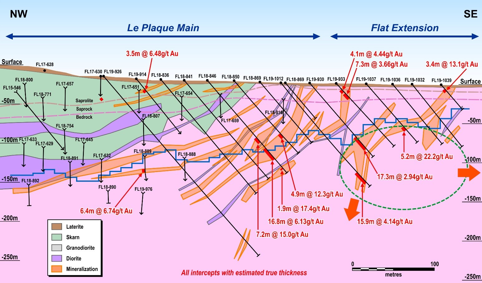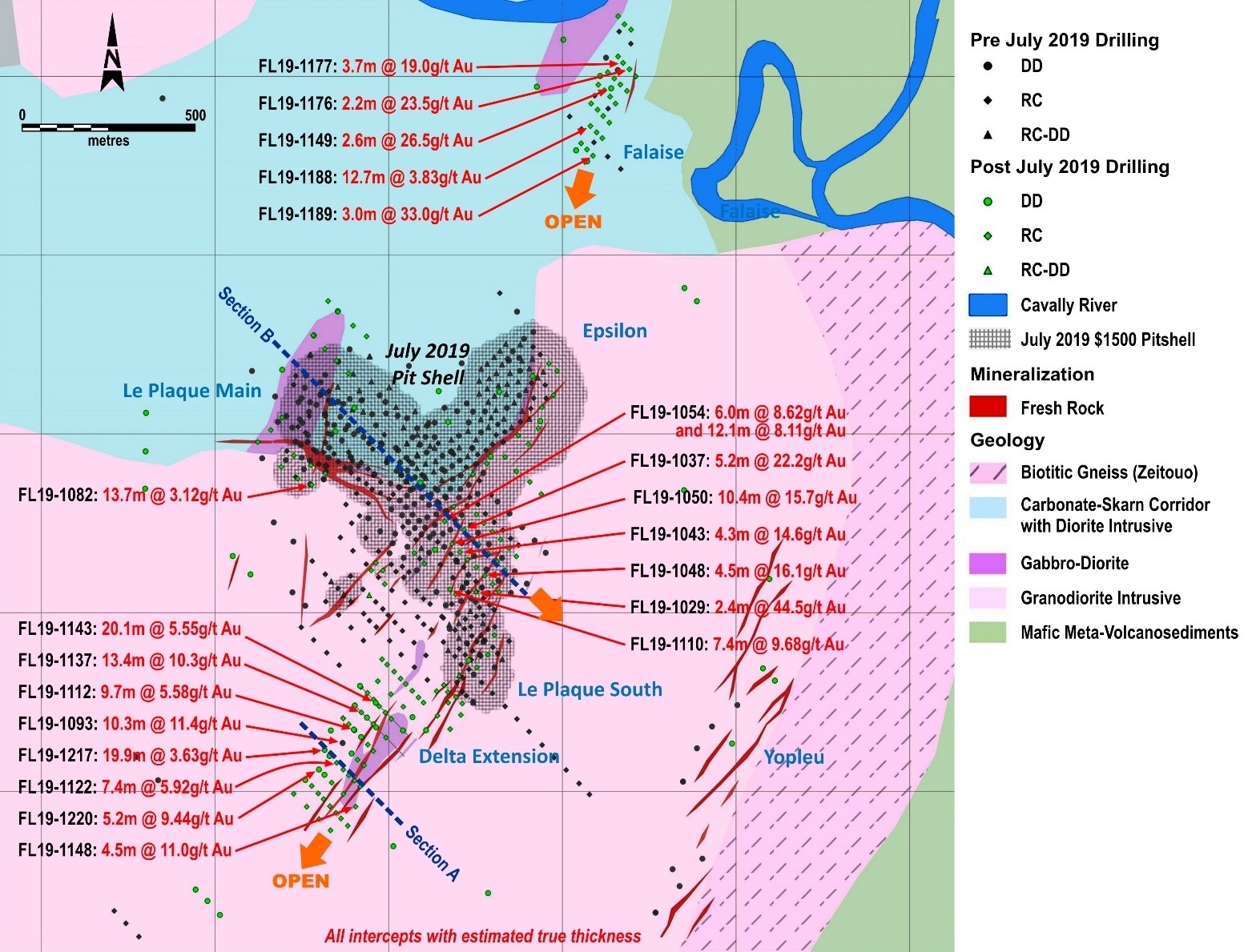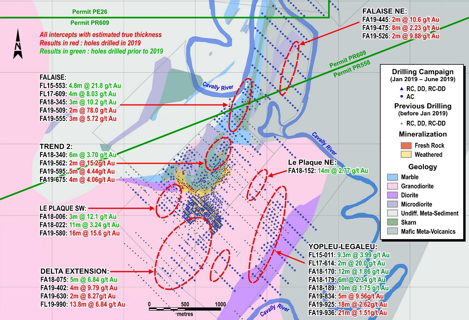Since the publication of the updated Le Plaque resource estimate in July 2019, a total of 51 Diamond Drill (“DD”), 143 Reverse Circulation (“RC”) and 1 RC/DD holes totaling 25,695 meters have been drilled in H2-2019 over the extensions of the Le Plaque deposit and 244 AC holes totaling 12,177m over other previously defined regional targets. The DD and RC drill results obtained were very encouraging as they confirmed mineralization of the lateral extensions of the Le Plaque deposit. As such, an updated reserve and resource estimate is expected to be published in late Q2-2020 to incorporate the drill data from the H2-2019 campaign and the ongoing H1-2020 drill campaign.