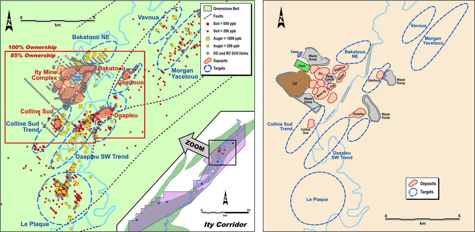 Figure 1: Ity Mine Gold-in-Soil Map and Simplified Map with Exploration Targets