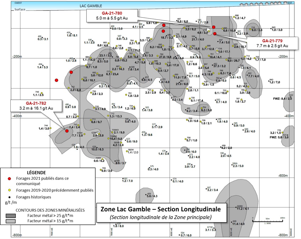 Figure 1- Projet aurifère Rouyn - Section longitudinale de la zone du lac Gamble et principaux résultats d'analyses de 2021