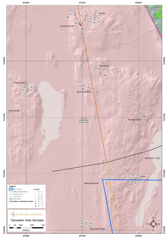 A series of surface grab samples were taken from a combination of known occurrences and some undrilled gold showings, with many samples being confirmation of historical work. Areas of primary interest include north of the Zam Zam North, Jowsey, Mystery South, and Behemoth zones, where drill targets have been identified for testing. A total of 64 out of 73 total rock samples collected from an intermittent sampling program during the summer returned greater than 0.50 g/t Au, with 34 samples running >5.0gpt, of which the highest-grade grab sample (71.9 g/t Au) was taken from a 3.0-meter-wide silica-sulphide alteration zone, with multiple narrow sub-vertical quartz-sulphide veinlets at the Zamzam North. This sample was taken 10.0m south of the northern limit of the Zam Zam Zone surface exposure. A review of historical sample data shows this value to be the highest grade reported over a 100 meters strike length of the intermittently exposed mineralization on the Zam-Zam North and South zones. Significant high-grade quartz-sulphide veins were also encountered at Zamzam South (55.1 g/t Au), Jowsey (18.1 g/t Au), 1010 North (56.1 g/t Au), Shenkman West (9.20 g/t Au), Mystery South (11.60 g/t Au), Aumo (6.09 g/t Au) and Behemoth Zone (4.97 g/t Au). These new gold assays from grab samples have continued to confirm the high-grade gold potential at Carscallen Property along the NNW SSE mineralized corridor. The recent mapping, sampling and the continued compilation of past work and information from past and planned drilling, will help establish a better understanding of the setting of the gold mineralization on the Property and will lead to new targets for exploration.