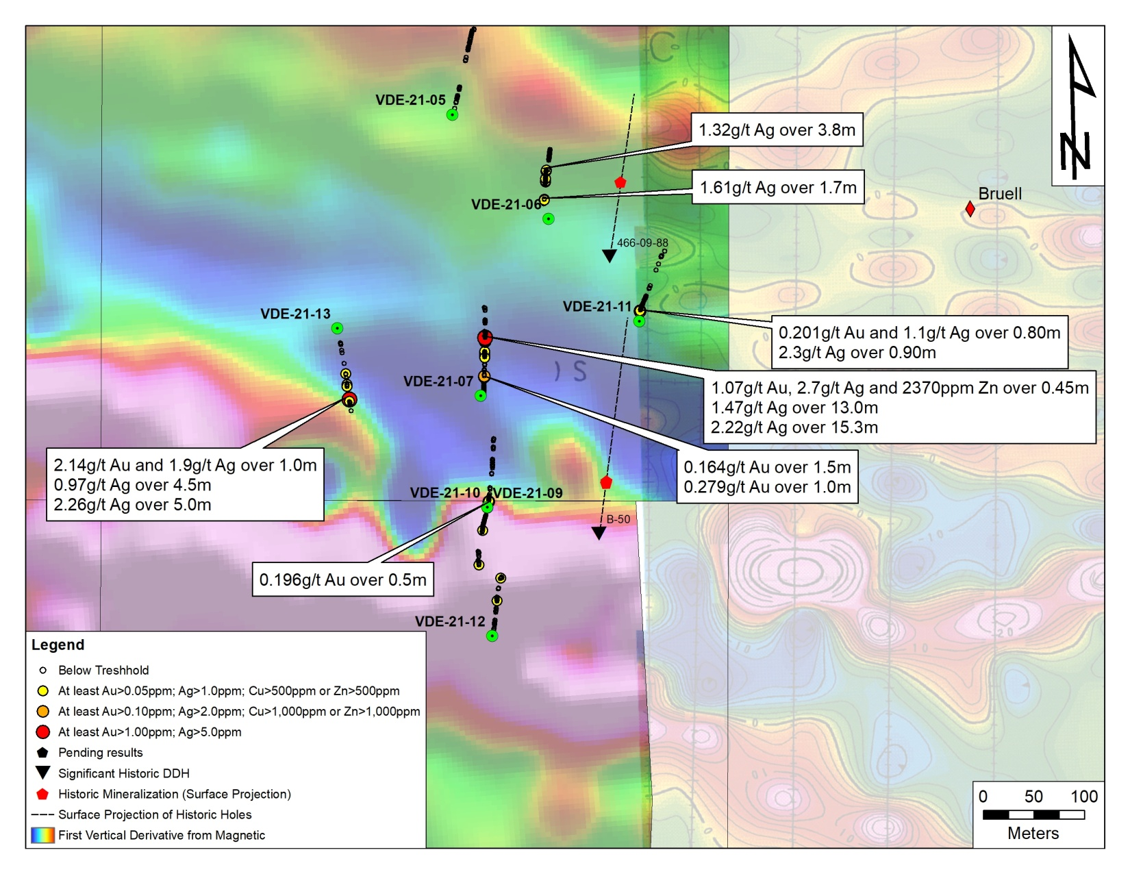 VDE-21-13 returned 0.97g/t Ag over 4.5m (from 69.0m to 73.5m deep) and 2.26g/t Ag over 5.0m (from 88.0m to 93.0m deep), including 2.14g/t Au and 1.9g/t Ag over 1.0m (from 91.0m to 92.0m).