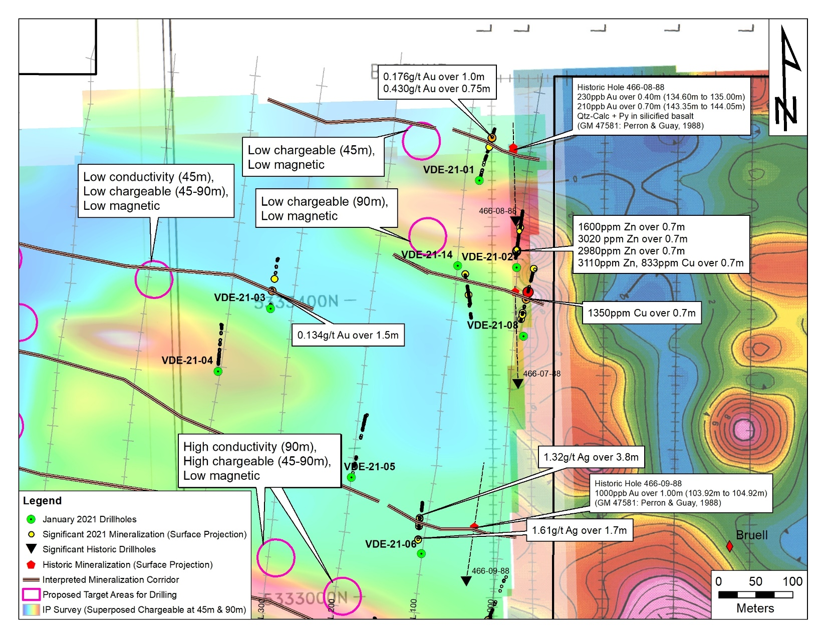 VDE-21-02 returned several zinc and copper values ranging from 1600 ppm to 3110 ppm Zn and 833 ppm Cu over length of 0.7m. VDE-21-02 is located in a shear zone at the contact with a quartz feldspar porphyry dyke (from depth 21.6m to 22.3m and 23.0m to 25.1m respectively). Silver values up to 1g/t over 1.4m and 1.35 over 1.6m was also obtained (from depth 23.0m to 24.4m and 69.0m to 70.6m respectively)