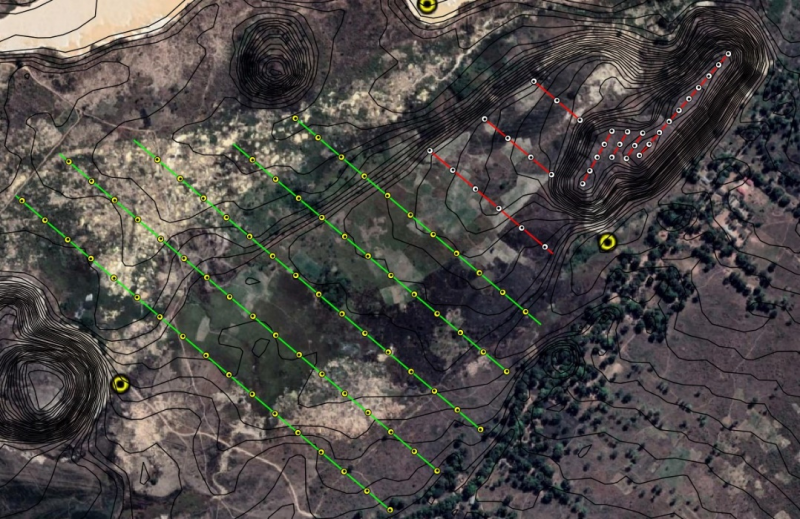 Figure 1. H dump planned drill holes. AC/RC drilling - red sections with white collars (34 holes estimated 1,500m). Cobra percussion gouge drilling – green sections yellow collar (72 holes estimated 500m to 700m).
