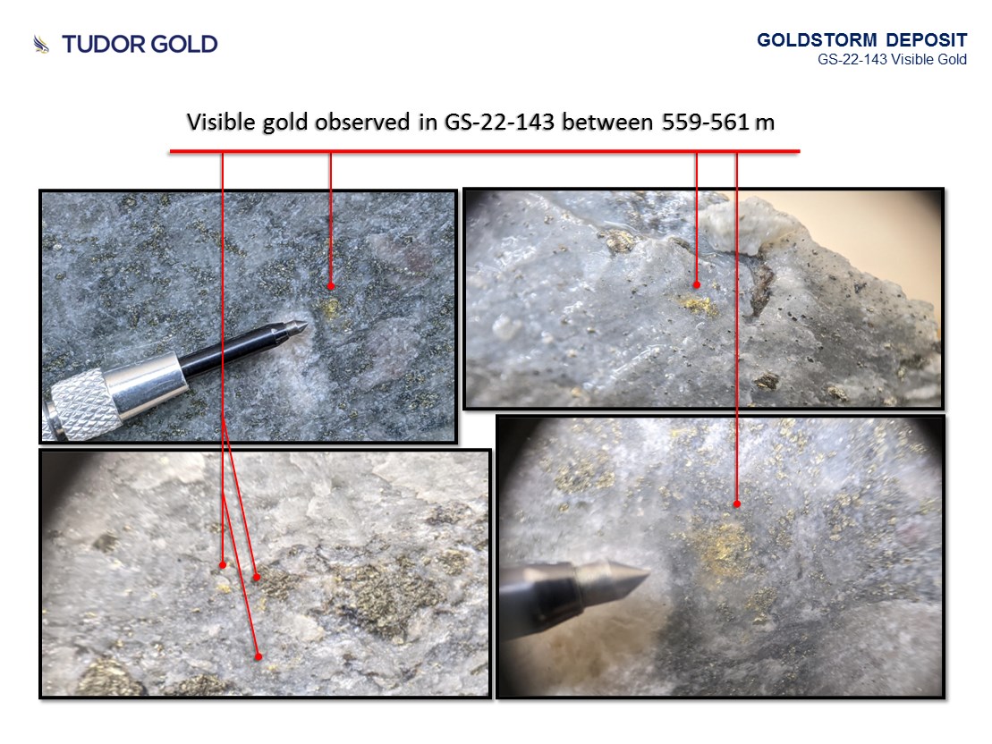 Ken Konkin, President and CEO of Tudor Gold and Director of Teuton, commented as follows: “We are extremely pleased to report this second consecutive high-grade, visible gold intercept from our northeastern step-out drilling. This 70.96 g/t AuEQ intercept over one meter is now [the] highest single gold grade intercept of the project. The unique aspect of the two-meter composite of 39.15 g/t AuEq and the 4.5 meter visible gold composite from GS-22-134 that averaged 20.86 g/t AuEQ is that they both appear to have similar modes of occurrence that resembles the gold mineralization at the Valley of Kings (VOK) Deposit at Newcrest’s Brucejack Lake Mine adjacent to our southern border.* Most of the free-gold mineralization at the Goldstorm Deposit is associated with quartz-pyrite veinlets but it also appears as fine disseminated grains of free visible gold within host rock as observed in this high-grade intercept within GS-22-143. This may be a colloidal-type mineralization which is also observed at the Brucejack Lake Mine. Gold mineralization at the VOK Deposit occurs as electrum, however the visible gold found at the Goldstorm Deposit occurs as native gold. As with the discovery of R-66 to the southeast, these new high-grade gold intercepts may be completely different pulses of mineralization that can occur outside the known limits of the porphyry style of gold mineralization. Clearly more drilling is required to better understand the grade distribution and consistency within the northeastern portion of the Goldstorm Deposit.”