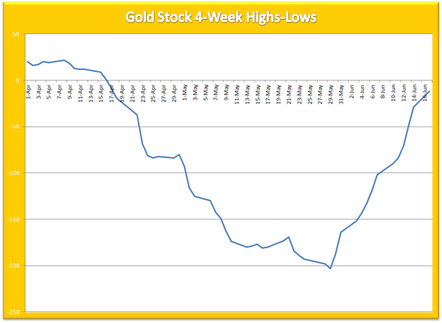 Let's now turn our attention to the gold mining stocks. While the companies which produce the metal obviously face some degree of risk in the near-term from a potential gold price pullback, the overall path of least resistance for the gold stocks remains up. That's the message of the 4-week rate of change (momentum) indicator of the new highs and lows for the 50 most actively traded gold stocks. As can be seen here, this indicator continues its impressively rising path as of Jun. 17. This provides a strong technical confirmation that the near-term demand for gold mining and exploration stocks is still strong enough to push prices higher despite the risks mentioned in this report.