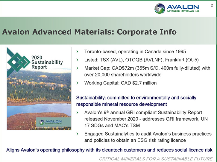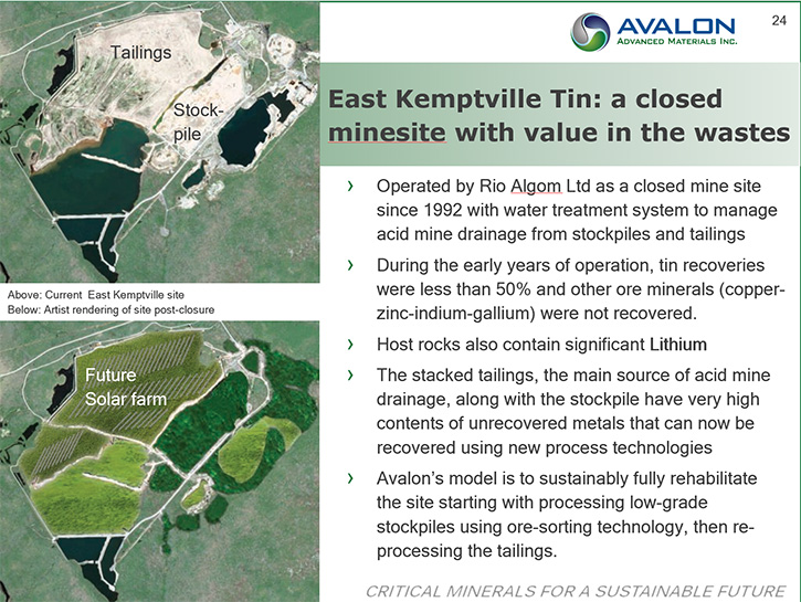 Avalon Advanced Materials Inc.Dr. Allen Alper::This is Dr. Allen Alper, Editor-in-Chief of Metals News, talking with Don Bubar, who is President and CEO of Avalon Advanced Materials, Inc. Don, could you talk about your participation in the Wall Street Green Summit panel on sustainable mining and about Avalon Advanced Materials and the situation with critical minerals? Also discuss the role Avalon is playing in this arena. Don Bubar:Sustainable mining is a general theme and encompasses a number of aspects of what we're doing. Number one we are trying to produce these critical minerals for clean technologies, in sustainable ways that are very ESG friendly (ESGI, in Canada now to include Indigenous). It requires more innovation, in terms of extraction processes, and more R&D on how we can better use some of these more obscure elements, in the periodic table, in beneficial ways, in clean technology. That helps create the demand to justify creating a supply, to serve the needs in clean technology. It just makes sense to produce them in sustainable ways. We have the opportunity now to look at historic mine wastes as opportunities to recover some of these non-traditional commodities, that were often present in mineral deposits, mined in the past for one traditional commodity, but weren't recognized as having any value and just went into the waste. One example we have been looking at for 15 years is the old East Kemptville tin mine, in southwestern Nova Scotia, which closed prematurely in 1992 after a drop in the price of tin. Such tin resources also contain other critical minerals, including indium, gallium, germanium and even lithium, where there are opportunities to recover these elements from the wastes, using new more efficient recovery processes,remediate the long-term liabilities while you do it, and contribute to the circular economy. The mining industry hasn't been thought of as being able to participate in the circular economy, but this is certainly one way that it can.