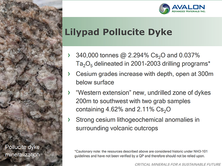 Dr. Allen Alper::Well, that sounds excellent, could you tell our readers/investors the primary reasons they should consider investing in Avalon Advanced Materials?Don Bubar:Exposure to a lot of these non-traditional commodities, like lithium and rare earths, as we've already talked about, and cesium and tantalum as well. But we also have potential for revenue in the near term, from our lithium project. We've also been looking at a couple of closed mine sites as opportunities. We have one in northern Ontario we're looking at, a closed phosphate mine, where the tailings and waste rocks still have quite a bit of phosphate in them that can be recovered easily, for growing applications in fertilizers. We're interested, because the phosphate minerals also contain very significant levels of rare earth elements and scandium that we believe we can economically extract and create a phosphate byproduct that can also be used in other fertilizer applications. We have opportunities for revenue from phosphate sales in the relatively near term. I would like to see Avalon looked at, as a growth company, in this whole new world of critical minerals and clean technology.