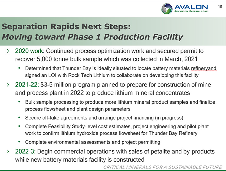 There is also growing interest in establishing lithium battery material supply chains here in North America and there's an obvious opportunity for us to participate in helping get it established. We're looking at a model, involving collaborating with other lithium explorers, on establishing a lithium battery materials refinery, in a central location in northwestern Ontario. The City of Thunder Bay on Lake Superior, with excellent transportation infrastructure, could serve as a central hub for processing concentrates, not only from our operation, but from other aspiring lithium minerals producers, in northern Ontario. There are lots of potential resources that could be developed, over the long term, to create additional supply for a refinery located there. Part of our thinking is to create new economic development opportunities, in northern Ontario, for Indigenous communities, to help in creating these supply chains and participate more in the new clean economy. Dr. Allen Alper::Excellent. What are your key plans for that project in 2021?