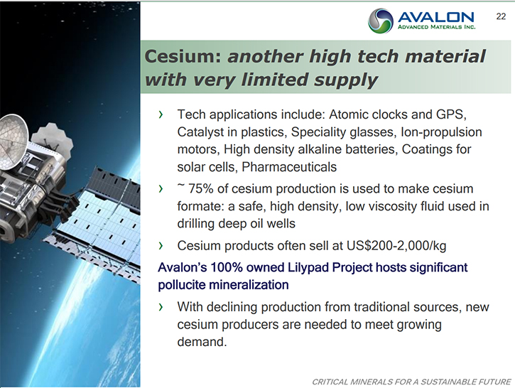 Dr. Allen Alper::Sounds excellent. Could you tell us about some of your other projects, Cesium and Tantalum projects?Don Bubar:Our cesium tantalum project, called Lilypad, is in northwestern Ontario as well, but in a little bit more remote location near the Ring-of-Fire. That's another one we've had for a long time that was originally explored for tantalum 20 years ago. There was a surge in demand for tantalum at that time and we had interest from a manufacturer in supporting development there. Unfortunately, that surge in demand faded before we got to the finish line. But the work we did there was successful in defining resources of interest, and we ended up finding a lot more cesium than we did tantalum. We've been waiting for a market opportunity to justify re-activating the project to develop the cesium component of the resources there. That time has arrived because there's now a global shortage of cesium as the one main supplier, a mine in Manitoba called Tanco, has basically run out of resources now. We have one of the few opportunities globally to create a significant new cesium supply. We're going to re-activate the project this year, get on the ground and hopefully be able to prove up a resource that we can get started fairly quickly.Dr. Allen Alper::That sounds excellent. Could you tell our readers/investors the uses for cesium?Don Bubar:Cesium has a lot of potential applications in the new technology. One of the most interesting applications is for atomic clocks that are needed in space technology that can keep time to a very highly accurate level, required for our space technology. While you don't need a lot of cesium, it's absolutely critical for that technology. Cesium is an element that is unique in the periodic table, as the most electro-positive element, which means any compounds that it forms are extremely stable. There are plenty of examples of how it's being used in such compounds. One product that has been produced at Tanco is cesium formate, a stable high-density fluid, with the same viscosity and clarity as water, but two and a half times as dense. It was used as a specialty drilling fluid in deep oil well drilling that could be recycled because it's so stable. Cesium has lots of other potential applications in electronics technology, renewable energy, glass, and many other things once a new supply is created.