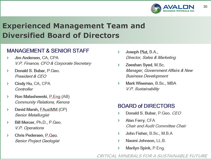 Dr. Allen Alper::That sounds very good, Don. Could you tell our readers/investors about your background and your Team?Don Bubar:I'm a geologist and I've been in the mineral exploration industry in Canada for over 40 years now. I started Avalon 26 years ago and have had a vision for getting these lithium-tantalum-cesium supply chains started for 25 years now. I've put together a team, with the skill sets needed to take advantage of this new opportunity, to produce these critical minerals, in sustainable ways, using new technology.