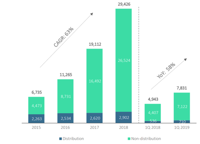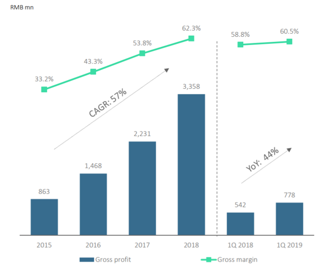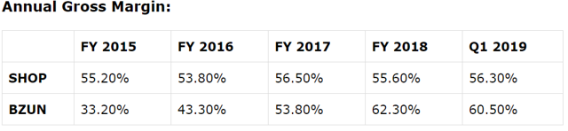 Ever since it went public, BZUN has been delivering shining growth results. One of the major metrics we look at is the GMV (Gross Merchandise Volume, or the value of everything that is sold) through the platform. BZUN's GMV has been growing at CAGR of 63% in the past few years. Even in the slowing economy, BZUN delivered 58% YoY growth of GMV in 2019 Q1: