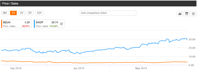 So apparently, the market buys the business model and the potential of (even U.S.) e-commerce. With SHOP trading at nearly 30x price/sales and BZUN at only 3.3x, we think BZUN is largely undervalued: