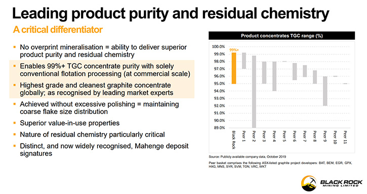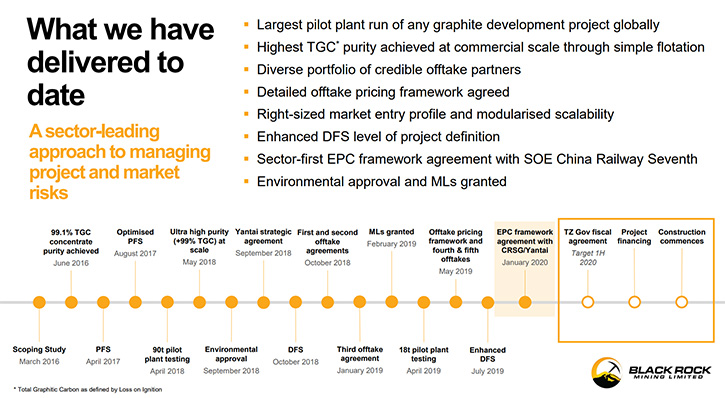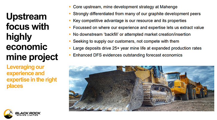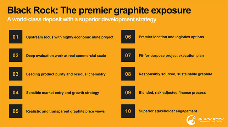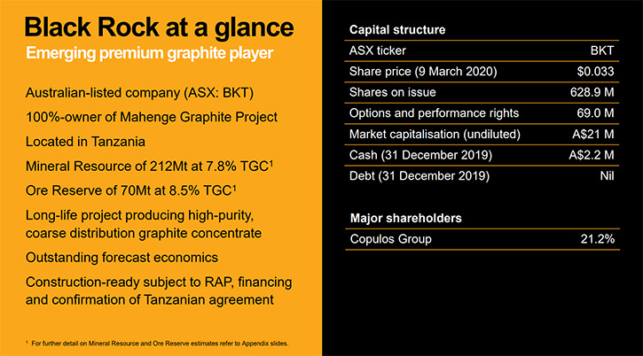 Black Rock Mining Ltd (ASX: BKT) has a 100% interest, in the Mahenge Graphite Mine, located in Tanzania. The Project has a JORC compliant Mineral Resource Estimate of 212m tonnes at 7.8% TGC. It also has Ore Reserves of 70m tonnes at 8.5% TGC. The Ore Reserves support a mine life of up to 350k tonnes of graphite per annum, for a reserve life of 16 years. The 2019 enhanced Definitive Feasibility Study for the project, which was based on strong customer demand, demonstrates exceptional financial metrics, including low CapEx, high margin, low technical risk, as well as superior economics targeting an annual EBITDA business of US$306M. We learned from John de Vries, Chief Executive Officer and Managing Director of Black Rock Mining, that due to its unique geology, Mahenge has a significant advantage, with high-grade and a larger distribution of premium large flake graphite. We learned from Mr. John de Vries that Black Rock collaborated with POSCO of Korea, one of the world's largest anode producers, on battery cell testing that confirmed Mahenge graphite concentrate meets battery grade requirements as Lithium-Ion Battery anode pre-cursor.
