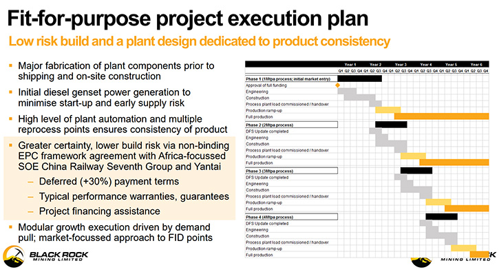 Dr. Allen Alper:You have some very interesting returns projected and also a little CapEx. Could you talk about that aspect of the project?John de Vries:Capital has been an interesting exercise for us, because again, if we go back to our business model, we prefer to collaborate. In our approach, we have used Chinese EPC and Chinese equipment supplies. Why? Because effectively the people we're dealing with in China have built four graphite plants in China that work, so we'll use them and gain experience and reduce technical risk in the process. The Chinese EPCM alliance is also delivering a deferred payment arrangement. So effectively, out of a US$75 million equipment supply and construction contract, about US$35 million of that will be deferred, until after the plant is commissioned and running successfully. But what this really represents for us, is a performance warranty and soft finance option combined into one. Because we are working in Tanzania, we have collaborated with the local financial institutions, including a relationship with a parastatal bank, the Tanzania Investment Bank, or TIB. We are working with TIB to assess the depth of local financial markets. This is all about aligning our interests. Module one will cost US$116 million, which includes most of the ongoing infrastructure, required for subsequent modules. Then, when we build out modules two, three, and four, driven by customer demand, we can cash flow and debt fund them, as they will attract significantly lower capex. The modular strategy gives us the flexibility to respond to customers and market signals quickly, so we only grow when the market allows it.In other words, if you are going to build an airline, most people start off with Boeing 737 or A320, even though one A380 may work. The reality is the A380 makes a lot of money when it's full. It loses a lot of money when it's not full. Having lots of smaller modules gives us much better control, when we bring capacity and product into the market. This strategy which we call, "Crawl, Walk, Run, Sprint" is all about maximizing effectiveness at the right time.