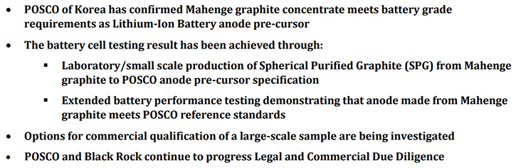 Also, it means that the graphite doesn't need to be highly processed before it is useful as a commercial product. In a typical graphite plant, you might have 14 or 15 processes before you produce a commercial product. At Mahenge, we will have fewer processes, or stages where the graphite is polished, means we retain a greater portion of the large flake.This Geology advantage provides Black Rock with product optionality - 35% of our graphite is aimed at the battery anode market, while 65% of our larger flake product will enter under- supplied, higher price markets. This speaks to a higher margin business, and important yield value for our customers. Our approach to the battery anode market has been to collaborate with the existing globally established supply chain. And this is where the partnership with POSCO has come from. POSCO is one of the world's largest battery anode producers, with an ambition to grow to 20% share of the global market, and clearly targeting the significant demand coming from electric vehicles driving the Lithium-Ion Battery boom.We have spent a long time working with POSCO, who has assessed our capability to supply high quality natural flake graphite, into their battery anode supply chain.This culminated in a recent announcement, where POSCO confirmed that Black Rock's Mahenge Graphite met their specifications for battery anode, essentially confirming that we have saleable product in this highly competitive, battery anode market. A fantastic result, which confirms our upstream business model - we're a miner and that's where our skill set is and POSCO is a battery anode maker.It's much better to work with a globally established business like POSCO and leverage their channels to market. It is simply far too risky for us to setup a downstream manufacturing business to take on our customers, and other globally established battery makers. Because our Geology is so good, it means that we can stay upstream and focus on mining the best Graphite on the planet.