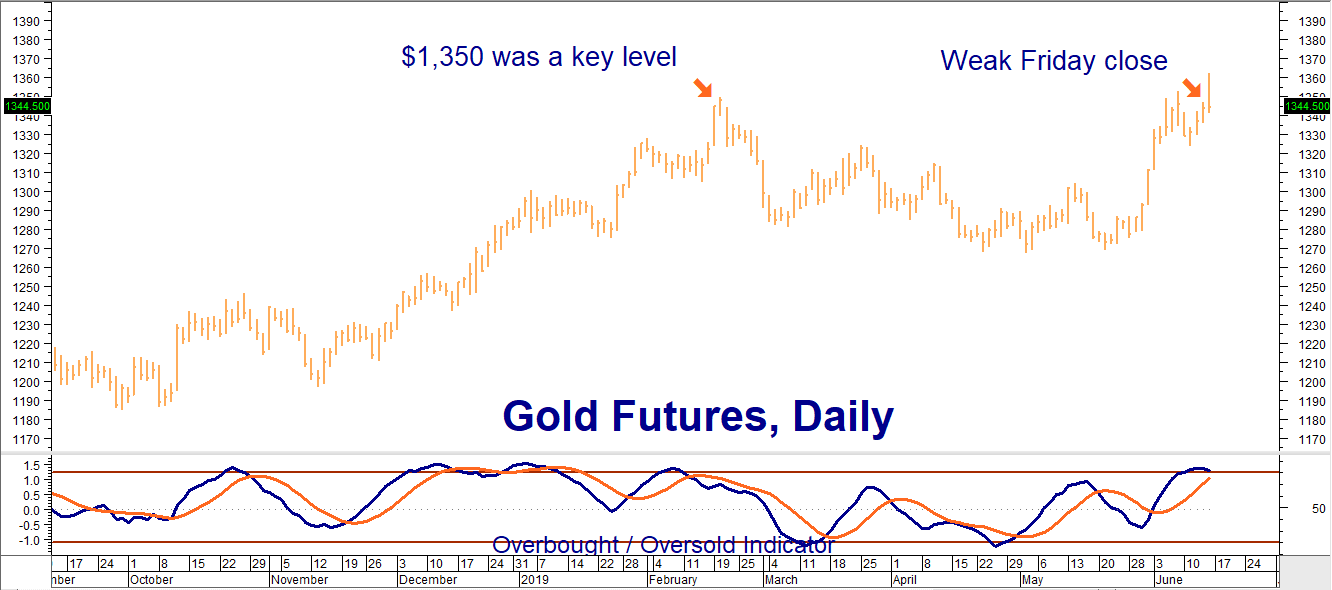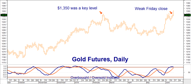 Friday brought good news and bad news to the gold market. The good news was the yellow metal's ability to breach the key $1,350 level. The bad news was its inability to hold above it. Instead of pumping their fists in the air, gold bulls are anxious as their favorite metal fails to follow through yet again. Bulls have even more reason for concern. Gold is overbought and, given Friday's weak close, extremely vulnerable to near-term declines.