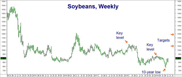 Like corn, growing conditions could be much worse than forecast. That's why we've added a second, longer-term target of $12.00 per bushel. A breach of our second key level of $10.71 per bushel will open the door. RMB trading customers who took our suggestions in previous blogs to purchase November 2019 and November 2020 bull spreads using CBOT soybean options should continue to hold their positions.