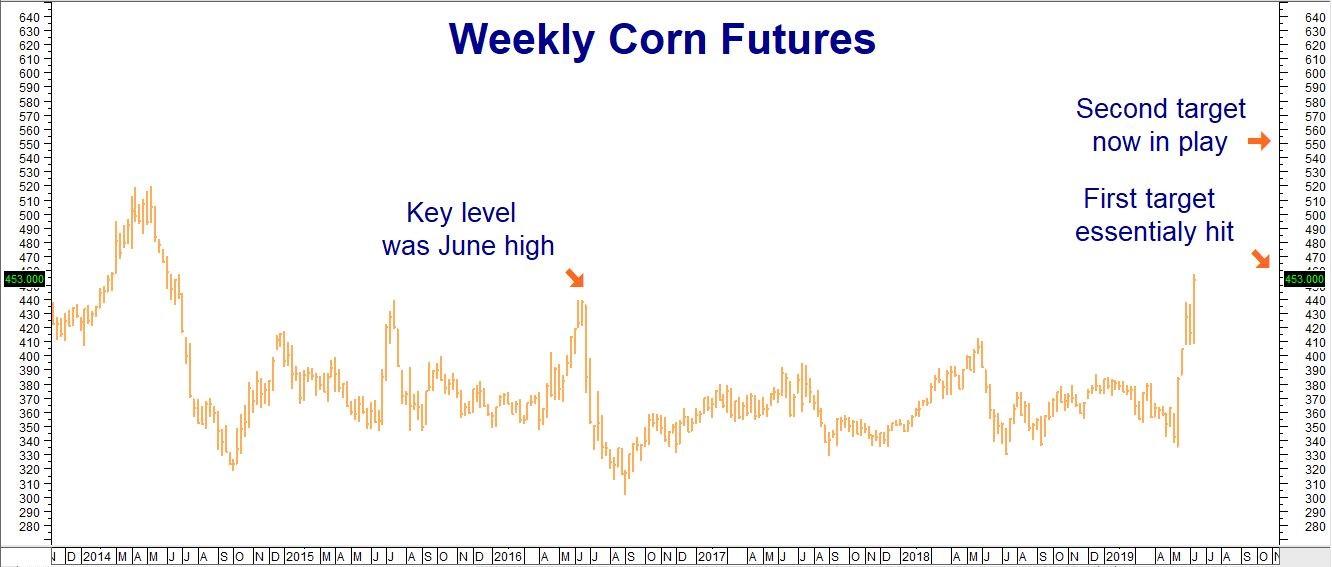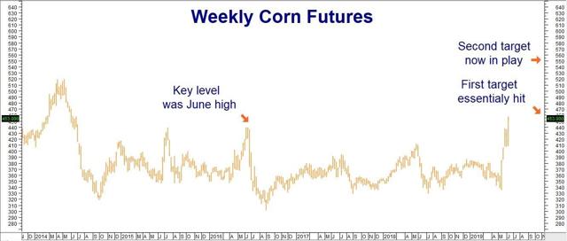 Prices exploded following the USDA's mid-May planting report and haven't looked back. The front-month, old-crop futures soared from a low of $3.35 per bushel to Friday's high of $4.5725 - a gain of 36% in just five weeks. Corn came close enough to hit our first technical price target of $4.60 per bushel for us to consider our first target reached.