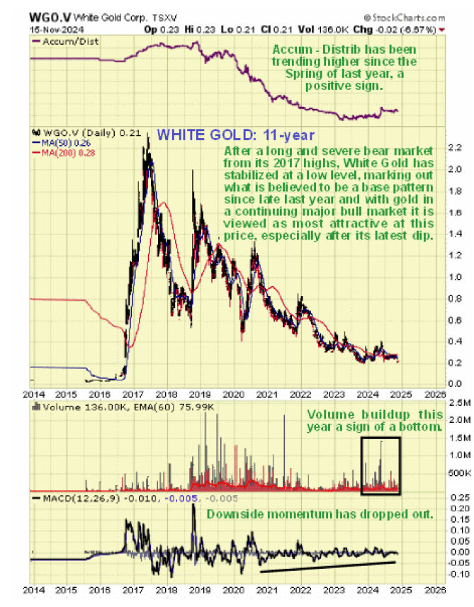 Zooming in now via a 3-year chart we can see that White Gold very likely hit a final low about a year ago at CA$0.20, this contention being supported by the preponderance of upside volume since that time that has caused the Accumulation line to trend higher, a positive sign.