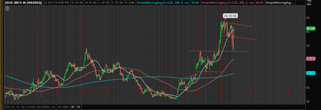 Yesterday was a wildly volatile day for JNUG as its price swung over 20% in a matter of 24 hours. JNUG's move to the downside caught support at the $60.45 level which happened to be the top line of resistance for its previous leg up. After bouncing from that support, it found its way back into its former trading territory.
