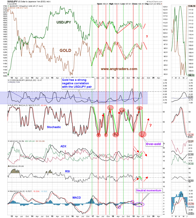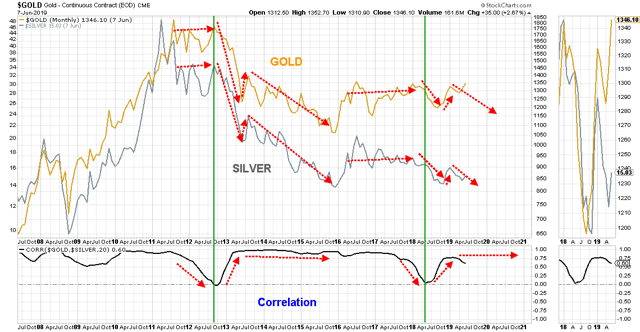 The correlation between gold and silver is normally strongly positive; however, in 2012 and again in 2018, the correlation dropped suddenly before recovering. Both gold and silver seem to be replicating the pricing pattern that formed during the 2012-2016 period. Last week's bounce in gold and silver prices continue to fit within the pattern (chart below).