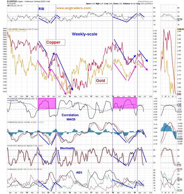 The same can be said for the correlation between gold and copper, while not as strongly positive as with silver, it is still positive on average. The similar patterns in the price and in the various momentum indicators of copper and gold continue to replicate as during the 2014-2016 trading period, despite the drop in copper (chart below).