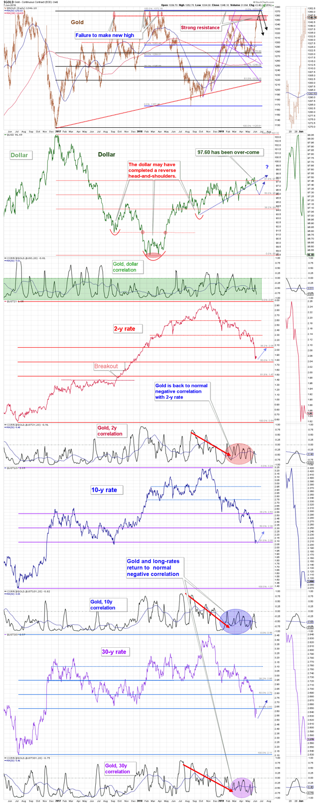 Gold's fear trade was caused by lower rates and a lower dollar. We think that the pullback in both rates and the dollar is almost complete, and after some possible further slippage is likely to reverse (chart below).