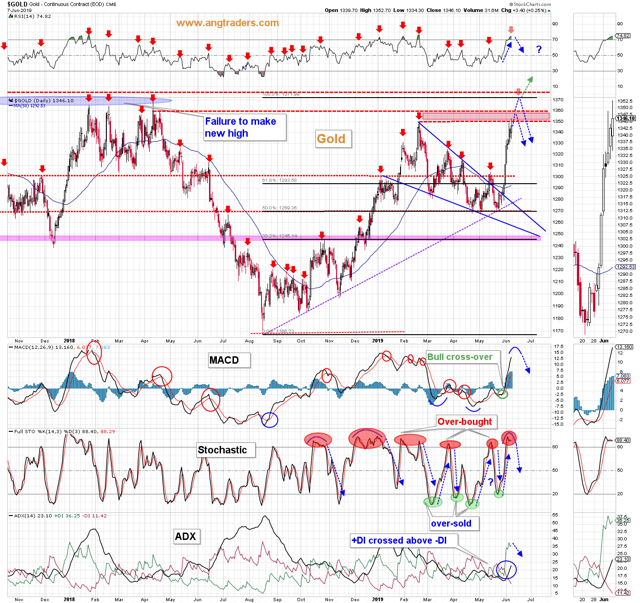 RSI is in overbought territory. MACD is elevated. Stochastic is at overbought levels. +DI of the ADX is elevated. Gold price has strong resistance at $1,350-1,360, and $1,370.If gold closes above $1,370, however, then the probability of further gains increases greatly (chart below).