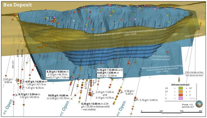 At an area known as Golden Pond near surface drill grades include 5.07 g/t over 15 meter and 16.53 g/t over 13.6 meter. and in the Triangle area returned grab sample result of 177.5 g/t Au.