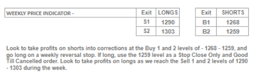 Quoting from the report: "The B1 level as we come into next week is $1,268, which is the extreme level below the mean of $1,281, and the buy 2 (B2) level is $1,259. The B1 level is the 1-to-1 relative implied volatility, which automatically identifies for you that when the price touches this level, there's a 90% probability that the price will revert back to $1,281. If it touches the B2 level there's a 95% probability that a reversion will occur back up to $1,281, which is the average price for this coming week. If we close above $1,281, it activates the S1 level above the mean of $1,290 and S2 of $1,303."