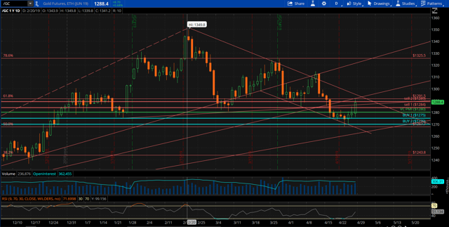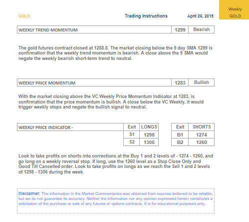 In the April 22 report, we said, "If we close above $1281, it activates the S1 level above the mean of $1290 and the S2 of $1303." The high that was made on the 26th was at $1,290.90 and gold closed at $1,288.40.