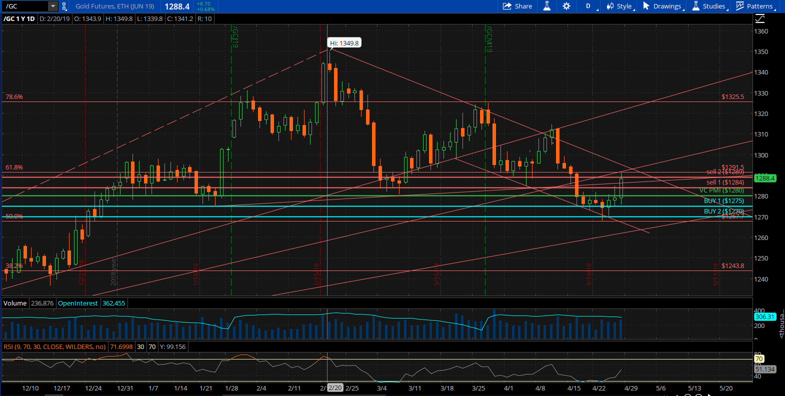If we review the movement of the algorithm, if you came into this past week short, covered at $1,268, reversed and went long with your first target at $1,281, you did well. A close above $1,281 activated the target of $1,290, which was completed on Friday. This shows the accuracy of the artificial intelligence underlying the VC PMI, which uses the relative implied volatility of the market to identify targets above and below the mean.