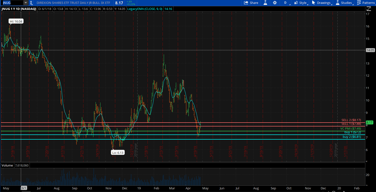 One advantage of an ETF like JNUG, is if you buy 10,000 shares, you can scale out of your position by selling some of your position bit by bit over time. If you own one futures contract, you would have to sell it all. JNUG allows you to hold it overnight, too. Furthermore, when the VC PMI identifies a harmonic convergence, there's really no need to use a stop. You have the luxury of holding onto your ETF until it reaches your price, as in the case above.