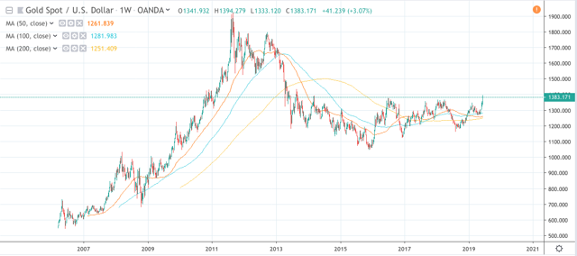 As opined in my article just a few days back "Gold On Cusp of Breakout," the yellow metal would develop wings once it thrusts past the 1,365 resistance. When my piece was published, Gold (GLD) was trading at 1,341. Just three days later, Gold is now trading at 1,383 with today's high at 1,394. Gold is looking precious right now, and looks set to go 100-200 points higher. Gold has been trapped in a very tight range between 1,050 to 1,365 for close to 4 years. A breakout from this containment will likely be extremely forceful.
