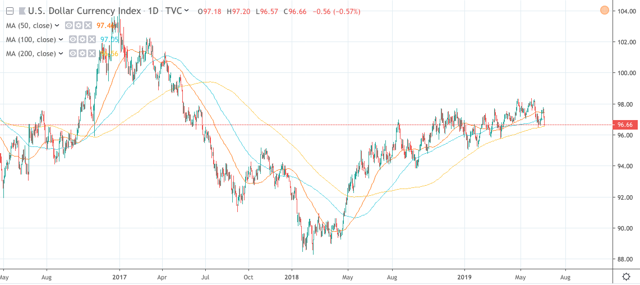 The Dollar Index (UUP) is facing tremendous resistance around 98, and the sudden U-turn in Fed policy will leave many Dollar bulls entrapped in a currency that both its domestic central bank and president want lower. The Dollar Index has weakened more than 1% against all its peers since the Fed meeting, and looks very likely to fall below its 200-day moving average support.