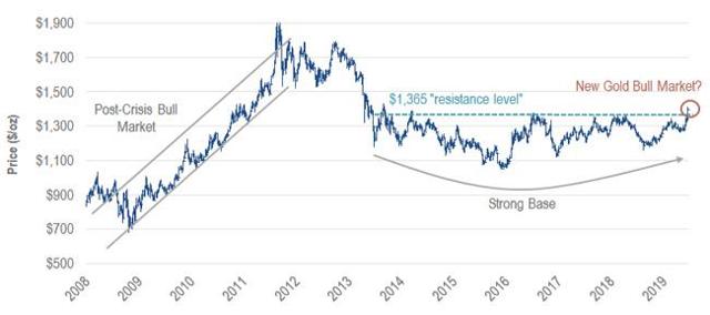 The shift in central bank policies denotes a change in the macroeconomic environment that brings new levels of risk to the financial system. Central banks see a downturn coming. However, many investors believe they have limited ability to fight a recession with U.S. interest rates already at 2% and European interest rates below 0%. In addition, quantitative easing has lost its efficacy. Layer on global trade and geopolitical tensions, and it is not hard to imagine a "flight to safety" that moves gold much higher.