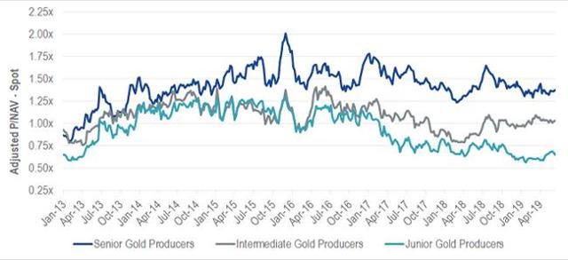 Price-to-Net-Asset-Value of North American Gold Producers (at Gold Spot Price)