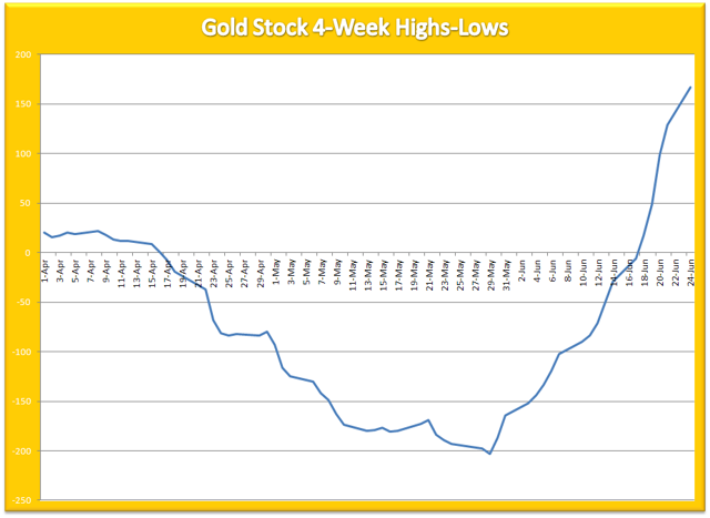 Shown below is my favorite indicator for gauging the overall health of the 50 most actively traded U.S.-listed gold mining and exploration stocks. This 4-week rate of change in the new highs and low has been rising sharply on a sustained basis since May. This was the indicator that gave an advance warning that the gold stocks had rally potential last month and it has been worth its proverbial weight in gold (pun intended). As I've emphasized in past reports, as long as this indicator continues rising, investors are justified in maintaining a bullish posture toward the gold stocks in general.