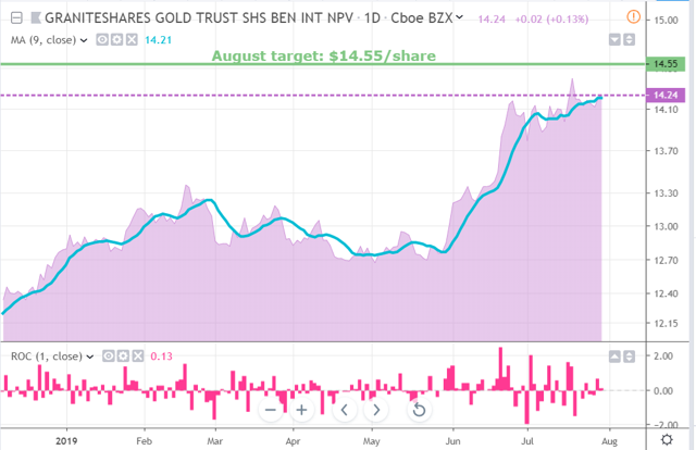 BAR is directly impacted by the vagaries of gold spot prices because the Funds physically holds gold bars in a London vault and custodied by ICBC Standard Bank. The investment objective of the Fund is to replicate the performance of the price of gold, less trust expenses (0.20%), according to BAR's prospectus.