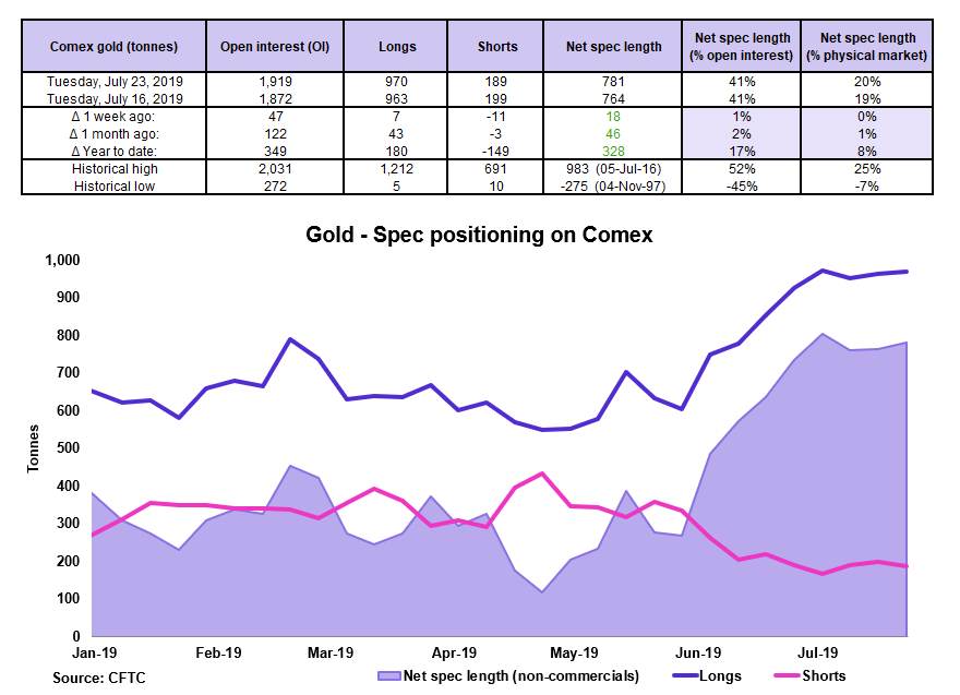 Speculators left their net long exposure to Comex gold broadly unchanged in the week to July 23, for a second week in a row.