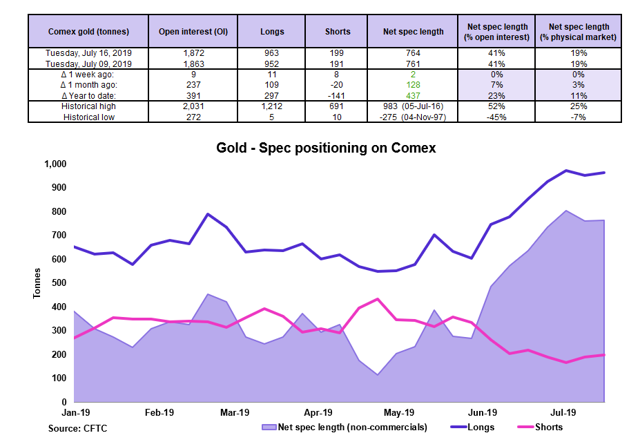 Speculators left their net long exposure to Comex gold broadly unchanged in the week to July 16.