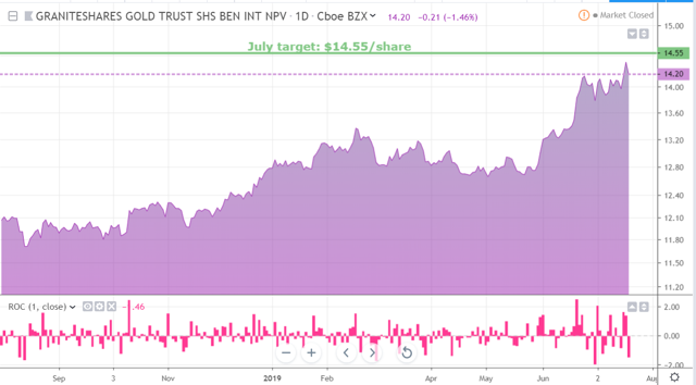 BAR is directly impacted by the vagaries of gold spot prices because the fund physically holds gold bars in a London vault and custodied by ICBC Standard Bank. The investment objective of the fund is to replicate the performance of the price of gold, less trust expenses (0.20%), according to BAR's prospectus.