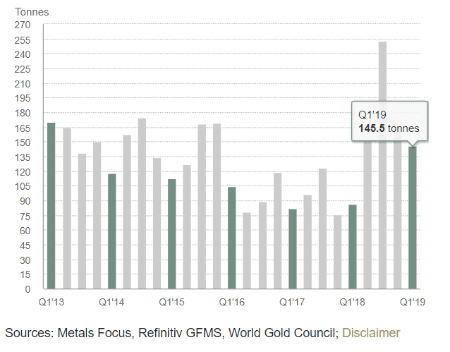 The World Gold Council shows that the trend has continued since the start of the year, with already a net buying of 145 tonnes in Q1.