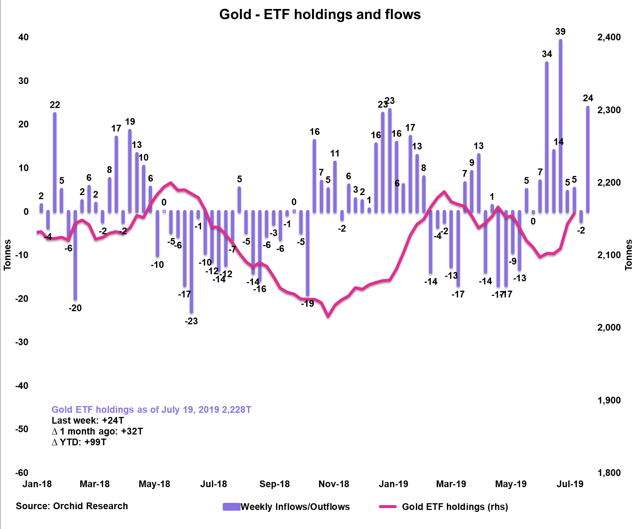 Gold ETF holdings increased by 24 tonnes over July 12-19 and increased by 32 tonnes over the past four weeks.