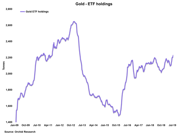 In the year to date, gold ETF holdings increased by 99 tonnes or 4.6%, which is significant, reflecting a positive swing in investor sentiment.